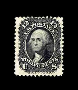 108 og 59 image#59, 12c Black "August", centered a bit to top as often found, intense color and impression on bright paper, part original gum, small surface scrape at bottom which is almost unnoticeable, very fine appearance for this great rarity; only fifteen Twelve Cent August issues have been certified by the Philatelic Foundation (plus there is an uncertified example housed in the New York Public Library) and the majority have faults to some degree; an extremely rare opportunity to obtain one of the rarest stamps in United States philately; signed W.H.C. (Warren H. Colson) and accompanied by a clear 1976 PF certificate, as well as a 2002 PF certificate; ex-Lutwak. (Image) 47,500.00