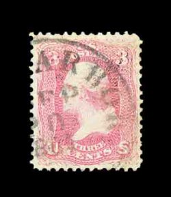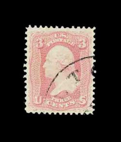 113 O 64 image#64, 3c Pink, an exceedingly choice used single, being exceptionally well centered within uncharacteristically large margins, plus its color and impression are unusually strong, light 1861 town c.d.s., extremely fine; 2002 PF certificate. (Image) 800.00