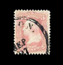 112 O 64 image#64, 3c Pink, a stunning used example of this scarce and distinctive shade, featuring numerous physical qualities rarely associated with this, including being superbly centered amid extravagantly large margins which are most uncharacteristic, plus its color is in a particularly intense and representative shade, prooflike impression on especially bright paper, even its perforations are unusually full and intact, all beautifully postmarked with a light and unobtrusive town c.d.s., an extremely fine gem in every regard; clearly among the finest quality used examples available of the 1861 Three Cent Pink; 2002 PF certificate. (Image) 800.00