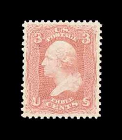 117 nh 65 image#65, 3c Rose, incredibly well centered within large margins, wonderfully fresh, with prooflike impression and exceptionally rich color with strong pink hues, in fact the pink untertones are so strong that in 1990 this stamp received a P.F. certificate as the Rose pink shade, o.g., n.h., extremely fine; whether this is a #64b or #65, it is truly a gem stamp; 1990 PF certificate (as #64b) and 2002 PF certificate (as #65). (Image) for hinged 130.00