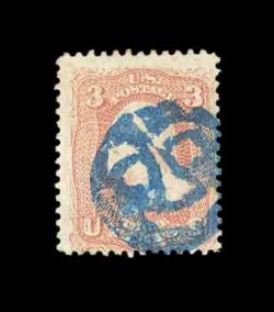 118 O 65 image#65, 3c Rose, fresh single with fine centering, bearing a lovely blue pumpkin face fancy cancel (Skinner/Eno #PH-P6), the strike is virtually complete covering a large portion of the stamp, but more importantly it is incredibly detailed and attractive, an extremely fine example of this and scarce in such nice condition; 1995 PF certificate. (Image) Est. 300-400