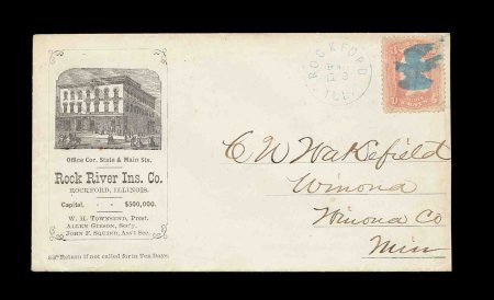 119 c 65 image#65, 3c Rose, fresh and well centered single with perfect central strike of Rockford Bluebird fancy cancellation, at left is the clear "Rockford/Ill./Dec 19" c.d.s. portion of this blue duplex, thus tying it to an exceptionally attractive illustrated advertising cover of Rock River Insurance Co., posted to Winona, Minn., extremely fine; the combination of a virtually perfect strike of this attractive and popular fancy cancel on a lovely advertising cover makes this one of the finest examples available; ex-Grunin. (Image) Est. 750-1,000