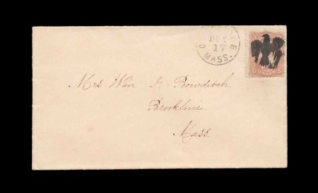 120 c 65 image#65, 3c Rose, with incredibly clear and detailed strike of fancy Eagle cancellation (Skinner/Eno #PA-B23), with Cambridge, Mass, c.d.s. at left, on marvelously fresh and completely intact light pink cover to Brookline, Mass., pristine extremely fine condition and a great strike of this cancel. (Image) Est. 500-750