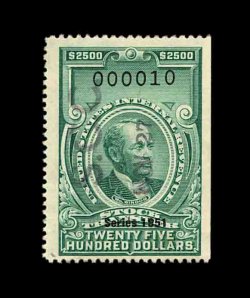 1182 O RD362 image#RD362, $2,500.00 Bright green, Series 1951, used, with black handstamp and an unusually faint cut cancel, strong color, certificate mentions two light horizontal creases at bottom which appear to us to be part of the cut cancellation, very fine; 2002 PF certificate. (Image) 1,000.00