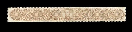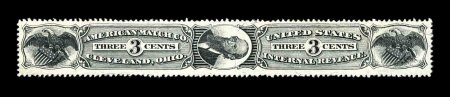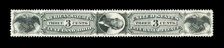 1192 O RO11a image#RO11a, American Match Co., 3c Black, a remarkably choice example of this handsome design, perfectly centered within large margins, only a thin perf. tip keeps this from being entirely sound and hardly worth noting considering that most examples are much more faulty and not nearly as well centered, extremely fine. (Image) 375.00