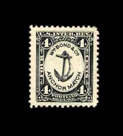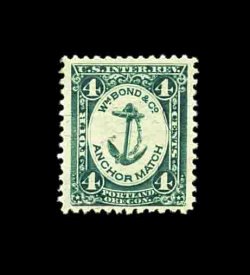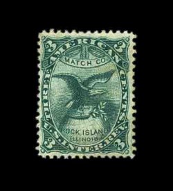 1194 O RO13a image#RO13a, American Match Co. (Rock Island), 3c Green, a magnificent appearing example of this very rare match stamp, unusually well centered as most of the few known copies cut the design and nearly all are more or less faulty, deep bright color, barely noticeable tiny edge tear at bottom and small thin spot, extremely fine appearance, one of the most attractive examples in existence of this elusive stamp that is missing from most collections; ex-Joyce. (Image) 4,000.00