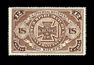 1195 O RO27b image#RO27b, Bendel, H., 12c Brown, silk paper, an exceptionally fresh example of this oversized stamp, large to extra-large margins, trivial edge thin at top which is far fewer flaws than most of these have, otherwise choice very fine. (Image) 375.00
