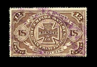 1196 O RO27b image#RO27b, Bendel, H., 12c Brown, silk paper, sound example with large violet cancel, fine centering and scarce. (Image) 375.00