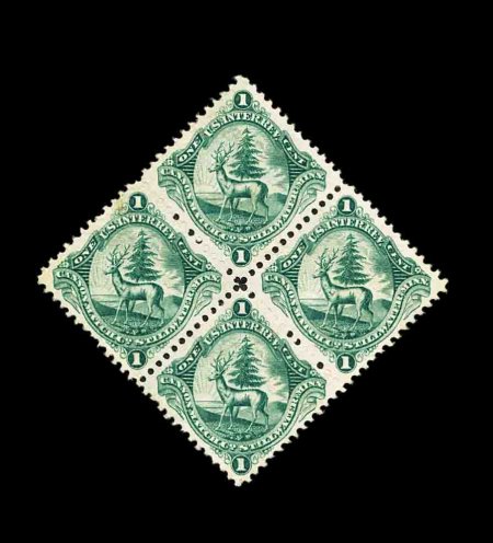 1204 Obl RO57c image#RO57c, Cannon Match Co., 1c Green, pink paper, exceptionally well centered and scarce block of four, small back flaws including a thin in one stamp, extremely fine appearance and a particularly desirable stamp to collect in a block of four with its diamond format. (Image) 160.00+