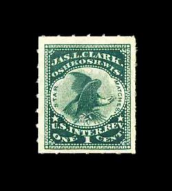 1206 O RO63d image#RO63d, Clark, James L., 1c Green, watermarked, rouletted, well centered single within large balanced margins, strong intense color, light thin spot, otherwise very fine. (Image) 325.00