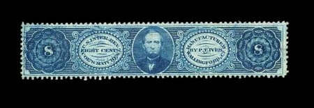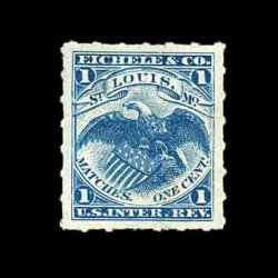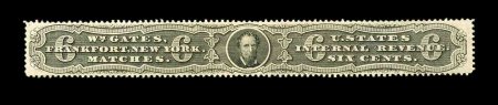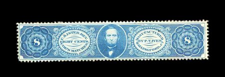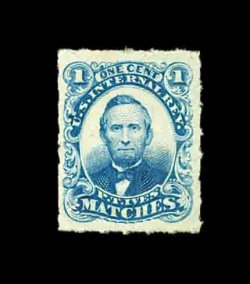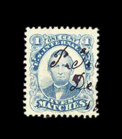 1217 O RO115u image#RO115u, Ives Matches, 1c Ultramarine, an exceptionally choice example of this distinctive ultramarine shade, neat ms. cancel which is a portion of "P.T. I(ves)" and date (probably the left half of a pair; a similar pair was offered in Joyce showing an illegal use paying tax on a check), lovely centering and sound, choice very fine. (Image) 225.00