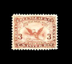 1211 O RO94c image#RO94c, William Gates' Sons, 3c Black, pink paper, magnificently centered stamp, paper is a dark pink color, completely sound, extremely fine. (Image) 135.00