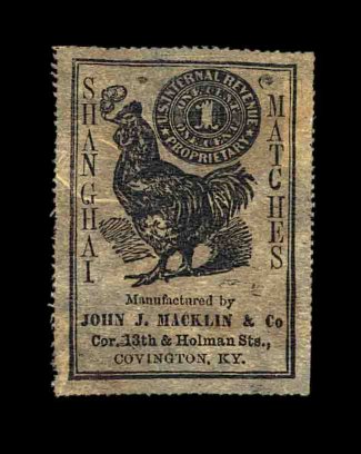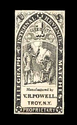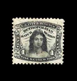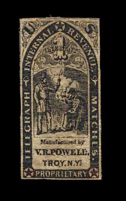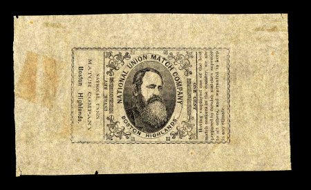 1222 O imageNational Union Match Co., 1c Black on buff wrapper, an interesting match box wrapper, while not listed in Scott because it is not a proper revenue stamp it is neither fake or bogus, rather, according to the Boston Revenue Book, it is the product of a small match manufacturer who was avoiding the tax, so it is real but fraudulent, it is speculated that his wrapper was imitating Byam, Carlton & Co. wrappers and the proprietor was competing with that company for business, he was arrested and fined for his activities, because of his small activities these wrappers are quite rare, printed on the frail buff paper like other wrappers it is subject to the small flaws typical of these, this one with small edge faults and spot of toning in the left margin, otherwise very fine; a rare and desirable addition to a match stamp collection; ex-Joyce. (Image) Est. 300-400