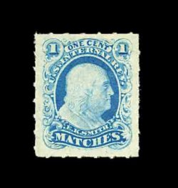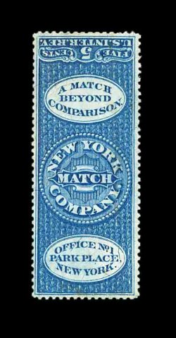 1223 O RO139b image#RO139b, N.Y. Match Company, 5c Blue, silk paper, an impressive eye-appealing example of a rare issue, this is undoubtedly one of the best centered of this stamp that is available, color is exceptionally bright and fresh, perforations are full and even all around, described in Joyce as a "superior example" not only because of its gorgeous appearance but because it lacks the faults that nearly all have, only the most trivial edge thin keeps this from being completely sound, extremely fine; ex-Joyce. (Image) 1,500.00
