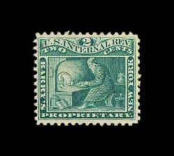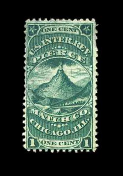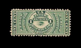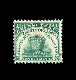 1231 O RP1 image#RP1, Kensett, T. & Co., 1c Green, the only private die revenue issued for canned fruit, fresh deep color, couple of tiny stain spots that nearly all of this issue seem to have and faint vertical crease at bottom, fine and rare stamp. (Image) 1,000.00