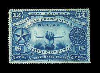 1227 O RO165b image#RO165b, San Francisco Match Co., 12c Blue, silk paper attractive with deep color, small flaws at top including a couple of toned perforations, fine and scarce. (Image) 375.00