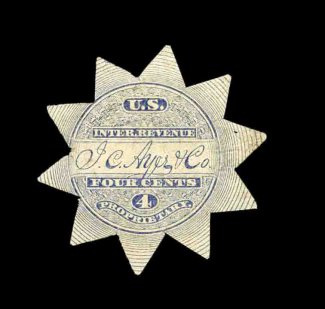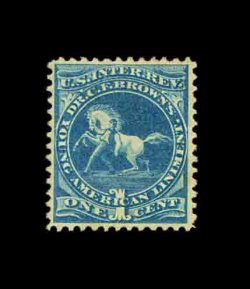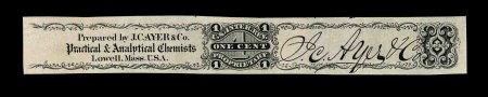 1233 O RS9u image#RS9u, Ayer, J.C. & Co., 4c Ultramarine, die cut, this stamp shows the true and rare ultramarine color distinguishing it from the myriad of blue shades that this stamp is found in, small faults including creases, very fine appearance and the only example we have seen offered; ex-Joyce. (Image) 525.00