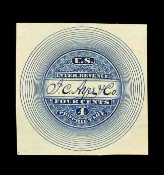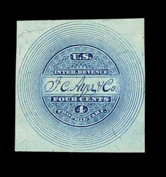 1235 O RS10d image#RS10d, Ayer, J.C. & Co., 4c Blue imperforate, watermarked attractive example with large balanced margins, color is deep with prooflike impression, trivial thin specks, otherwise very fine and bright stamp. (Image) 325.00