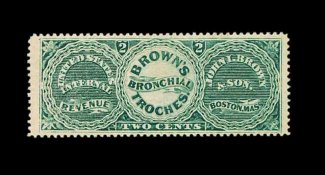 1240 O RS40c image#RS40c, Brown, John I. & Son, 2c Green, pink paper, an incredibly choice example, being wonderfully well centered with large to huge margins, in addition this stamp is amazingly fresh and completely sound, extremely fine gem and certainly one of the finest examples available. (Image) 300.00