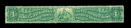 1281 O RS143b image#RS143b, Jackson, J.A. & Co., 4c Green, silk paper, a remarkable high quality example of this difficult stamp, these large stamps are typically centered into the design and faulty, this copy has exceptional centering and flaws are limited to a couple tiny thins and minor mounting stain that shows on the reverse only, a very fine and choice example of this. (Image) 225.00