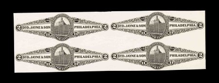 1285 Pbl RS145P4 image#RS145P4, Jayne, D. & Co., 2c Black, plate proof on card, a wonderfully fresh and attractive block of four, large margins all around, marvelously detailed and all one could ask for from a proof impression, a perfect mate to the 1c block, extremely fine. (Image) 400.00+