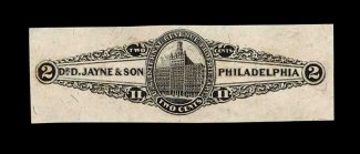 1286 O RS145b image#RS145b, Jayne, D. & Son, 2c Black, silk paper, imperforate, a wonderfully well margined stamp possessing choice attractive appearance, this exceptionally rare stamp, of which it is believed that less than ten examples are known, sports large to extremely large margins, and the deep black impression is razor sharp, only a couple of small thin spots and mild toning that only faintly shows to the front, not detracting from the extremely fine appearance of this very elusive stamp. (Image) 1,500.00
