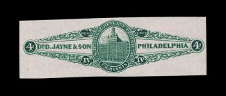 1289 O RS146c image#RS146c, Jayne, D. & Son, 4c Green, pink paper, imperforate, a lovely and impeccably fresh example of this very pretty stamp, the pink colored paper is about as deep and bright as it comes which attractively complements the deep green color of the printing, margins are large and full all around, in addition this stamp is entirely sound, extremely fine and choice condition that is superior to most of the existing examples. (Image) 1,200.00