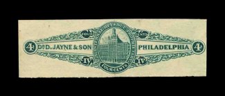 1290 O RS146d image#RS146d, Jayne, D. & Son, 4c Green, watermarked, imperforate, attractive four-margin single, deep green color and quite fresh though a couple of tone flecks are present, small thin, very fine appearance; despite its relatively modest catalog value, the known examples are comparable to other imperforates with only twelve to fifteen examples known. (Image) 450.00