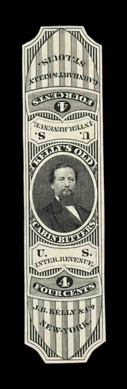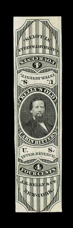 1292 O RS153e image#RS153e, Kelly, J.B. & Co., 4c Black, experimental silk paper, an exceptionally scarce issue with less than ten examples recorded, this one neatly cut to shape with balanced even margins all around, sharp prooflike impression, small thin spots, a fine representative example of this rare stamp. (Image) 1,900.00