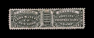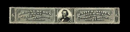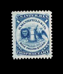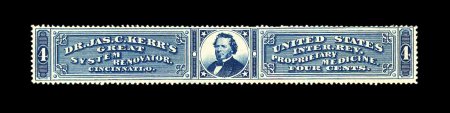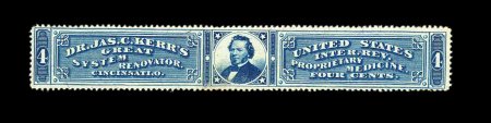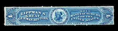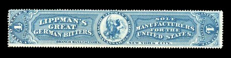 1297 O RS163b image#RS163b, Lippman, J. & Bros., 4c Blue, silk paper, marvelously choice example of a rare stamp of which there are less than a dozen examples recorded, this incredible stamp possesses intense deep color and razor sharp impression on bright fresh paper, centering is exceptional for this, the only fault is a light vertical crease which nearly every used example of this issue has, otherwise extremely fine; this was the best of two examples in the famous Joyce sale realizing $2,200.00, plus 10% buyer's premium, over eleven years ago; this is undoubtedly one of the finest, if not the finest, available example of this medicine stamp rarity; ex-Joyce. (Image) 1,750.00