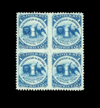 1299 O RS173jb image#RS173jb, Mansfield & Higbee, 1c Blue, silk paper, block of four imperforate between, a marvelously well centered example of this popular variety, very bright and fresh, essentially sound except for the faintest of small thins at top, choice very fine. (Image) 175.00