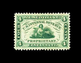 1321 O RS221e image#RS221e, Scovill, A.L. & Co., 4c Green, experimental silk paper, gem single with absolutely choice centering, being better centered than virtually any of the examples of this stamp even when they are the common paper varieties, sound and select in all other respects as well, extremely fine; the experimental silk paper issue is decidedly scarce and this is certainly among the finest available. (Image) 125.00