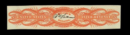 1322 O RS232a image#RS232a, Swain, Jas., 8c Orange, imperforate, an extravagantly margined example of this very scarce stamp in imperforate format and perfectly centered within those margins, all the examples we have seen have margins closer on one or more sides, brilliant orange color on fresh paper, trivial edge thin speck and one vertical crease which virtually every one of these stamps has, otherwise extremely fine and the most impressive appearing example of the handful of recorded copies. (Image) 1,750.00