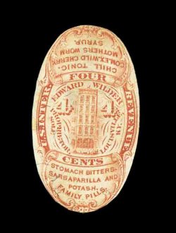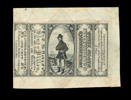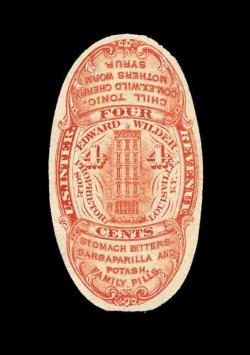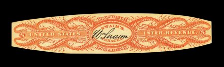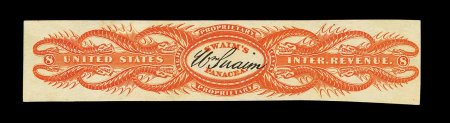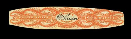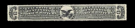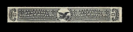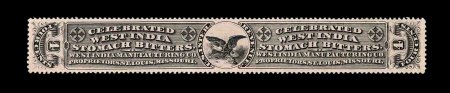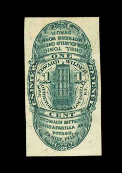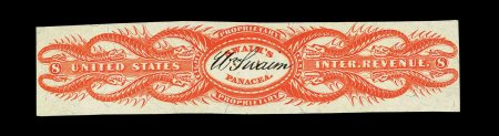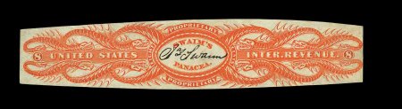 1332 O RS245e image#RS245e, U.S. Proprietary Medicine Co., 1c Black, experimental silk paper, wrapper, quite well margined example on this difficult paper, normal folds and creases plus other small faults from its normal use around a box of Dr. Roback's Blood Pills, very fine appearance for this; ex-Joyce. (Image) 450.00
