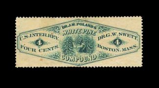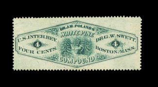 1329 O RS237d image#RS237d, Swett, G.W., 4c Green, watermarked, perforated, a very scarce stamp on this paper, well centered, faults as nearly all of these have including tiny edge tear and wrinkles, plus minor staining, nearly very fine appearance. (Image) 1,050.00