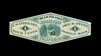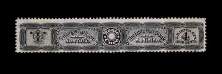1331 O RS240c image#RS240c, Tallcot, George, 4c Black, pink paper, a very presentable example of an exceedingly rare stamp, this issue is quite common on silk paper or watermarked paper, but on pink paper there are only three or four examples known, this example shows this variety exceptionally well as the paper is a strong dark pink, margins are clear to large all around though centered to the bottom, two small closed tears at bottom (all known examples are faulty), very fine appearance; this stamp comes from the Morton Dean Joyce collection and it is the only example that we have ever seen offered; a great medicine stamp rarity; ex-Col. Green and Joyce. (Image) 2,750.00