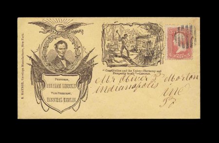 121 c 65 image#65, 3c Rose, tied to S. Raynor imprint design of beardless Lincoln and Hamlin campaign cover (Walcott #200), showing Lincoln splitting rails at right, stamp tied by light Louisville, Kentucky duplex, posted to Indianapolis, Indiana, trivial tone speck on perf. at right, which is totally insignificant to this pristine and marvelously well preserved illustrated cover, extremely fine; clear 1995 PF certificate. (Image) Est. 500-750