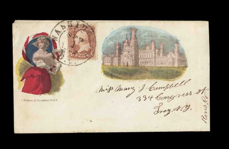 122 c 65 image#65, 3c Rose, well centered single with deep color, tied to Magnus imprint multicolor two-panel design with Lady Liberty and the Smithsonian Institute (Walcott #676), wonderfully fresh and attractive, stamp tied by 1862 Washington, D.C. c.d.s., to Troy, New York, extremely fine; a rare and desirable Magnus cover; ex-Walcott. (Image) Est. 750-1,000
