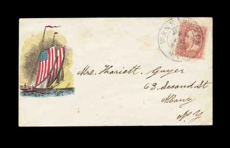 123 c 65 image#65, 3c Rose, tied to Magnus type patriotic multicolor design of sailing ship with United States flags as sails (not in Walcott; Weiss O-T-17), double circle "Washington/D.C./Feb 12 1863" c.d.s. neatly ties the stamp, a beautiful cover showing this very scarce naval design, extremely fine. (Image) Est. 500-750