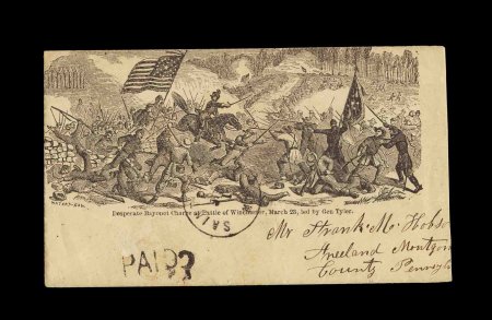 124 c imageBattle of Winchester patriotic cover, very attractive large design in black (Walcott #748), posted to Freeland, Pennsylvania, with bold "Paid 3" handstamp and "Saint Denis/MD/Jul 1" c.d.s. above, in addition to being a most attractive illustrated cover there is an enclosure dated June 30th from a Lieutenant at Harper's Ferry stating that the "Rebs is at South Mountan about fourty thousand strong. Whe expect a battol this weak" [sic], cover slightly reduced at right, not affecting the design, very fine. (Image) Est. 400-500