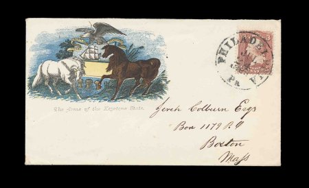 125 c 65 image#65, 3c Rose, tied by attractive "Philadelphia/Pa/Jul 24 1863" c.d.s. to attractive three-color patriotic design of the Arms of Pennsylvania (Walcott #1744), posted to Boston, all elements are fresh and neat, an extremely fine and beautiful cover. (Image) Est. 300-400
