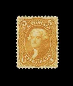 126 ng 67 image#67, 5c Buff, a spectacular quality example of this extraordinarily rare unused stamp, being one of just a handful of certified unused Five Cent Brown Yellow stamps that exist in true gem condition, featuring absolutely perfect centering amid margins that are uncharacteristically large for this typically tightly margined stamp, plus its color could not be more intense, nor its impression more deeply etched on bright paper, fully intact perforations surround the whole, extremely fine; an enormously rare and desirable example in this premium condition; easily one of the rarest stamps in United States philately to find both unused and in such a remarkable state of preservation; 2002 PF and PSE certificates. (Image) 10,000.00