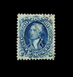 135 O 72 image#72, 90c Blue, a magnificent used example of this high value, possessing several desirable physical characteristics, including being perfectly centered within lavishly large margins, in addition it has strong fresh color and a clean impression, an unusually light postmark further contributes to this stamp's great eye appeal, an extremely fine gem in every regard. (Image) 425.00