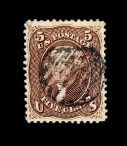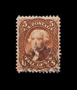 136 O 75 image#75, 5c Red brown, pretty used example of this notoriously difficult stamp, being virtually perfectly centered and margined for the issue, gorgeous deep rich color and a strong impression, very light and unobtrusive strikes of both a black rimless grid and a bit of a red transit cancel, extremely fine; 1991 and 2002 PF certificates. (Image) 510.00