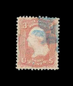 139 O 83 image#83, 3c Rose, "C" grill, an absolutely gorgeous used example of this very scarce grilled stamp, being in a quality that is almost impossible to find, featuring exceptional centering within uncharacteristically large margins, plus its color and impression are considerably stronger than typically found, complete and easily identifiable grill impression, all wonderfully postmarked with a highly desirable fancy Rockville, Ill. "bluebird" cancel, extremely fine; one of the finest quality used examples of Scott #83 we have ever offered; 2002 PF certificate. (Image) 1,025.00
