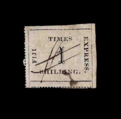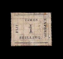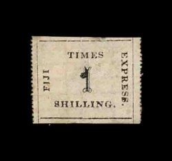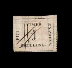 1384 O S.G. #4 imageS.G. #4, 1870 1/- Black on rose quadrille paper, position 11, an exceedingly attractive used example, large even margins all around and showing all or part of the rouletting on all four sides, neat ms. "#" cancel as usually applied at Levuka, rose color is fresh and bright, most remarkable in addition to all these nice features that affect its appearance is that this stamp is sound, without the usual faults that are almost always found on the "Fiji Times Express" issues, extremely fine; one would have to look hard to find another as nice as this; 1981 RPS certificate (Scott #5; $2,250.00). (Image) £1,800