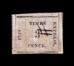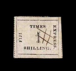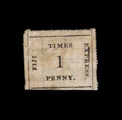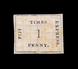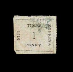 1388 O S.G. #1 imageS.G. #1, 1870 1p Black on rose quadrille paper, position 14, used single with scarce "Bau" star handstamp cancel, this small community on Vanua Levu Island is the only agency for the "Times Express" that had a handstamped cancel, and this cancel is only found on "Fiji Times Express" stamps, this is nearly a full strike of the eight pointed star but, as usual, it is light in the center and only faintly shows the negative "Bau" in the center, stamp is repaired in the top margin with a portion of the frame line drawn in, very fine appearance and a scarce cancel; ex-"Missionary" collection (Scott #1; $3,000.00). (Image) £3,500+