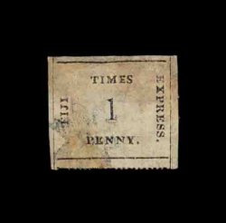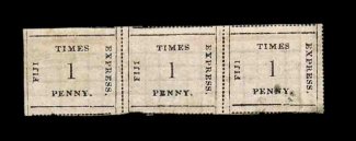 1386 O S.G. #1 imageS.G. #1, 1870 1p Black on rose quadrille paper, position 13, an apparently used example with an unusual vertical pen stroke over "Express" but in identical ink to that used for manuscript cancels on these issues, full to large margins with nearly full rouletting at top and right, light soiling, small pinhole and other minor flaws, nearly very fine appearance (Scott #1; $3,000.00). (Image) £3,500