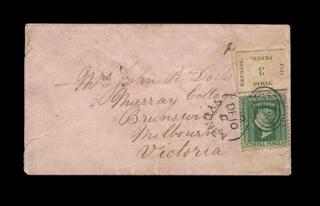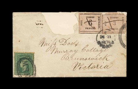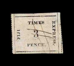 1400 c S.G. #2-3 imageS.G. #2-3, 1870 3p Black and 6p Black on rose quadrille paper, positions 1 and 24, an exceptionally rare "Fiji Times Express" cover posted from the "Fiji Times Express" agency at Rewa, the two stamps are cancelled with rarely seen ms. "X" and this cover establishes that at least this office used this type of marking rather than the "#" configuration that is more common and believed to have been the cancel of Levuka, stamps are faulty along the edges though actually they are quite well margined examples that come from the bottom left and top right corners of the sheet respectively, thus they would normally have been trimmed close on the outside edges anyway, both stamps are tied by "DE 31 1870 Sydney/NSW" duplex and the "NSW" portion of another strike of this duplex was used to tie the New South Wales 3p Green (S.G. #158) that was required for the foreign transmission, backstamped Melborne and Brunswick, piece missing from the front carrying over to the back from rough opening, but 1985 RPS of Victoria specifically states that no stamp is missing, small boxed "Rewa" marking at left, an important and wonderful "Fiji Times Express" usage. Rewa was a locality on the south side of Vitui Livu Island on the Rewa River, not far from Suva. Interestingly this community has no cancellations known for it by that name in the later governmental postal period. Nevertheless it was one of the original agencies listed by the "Fiji Times Express" as being open when service commenced on November 1, 1870. This is the only example of the four known first-issue covers that is clearly from an outlying agency. The previous cover has no Fiji cancel on the stamp to indicate origin and by rate is presumed to be Levuka and the other two (both franked with 3p and 6p values) have ms. "#" cancellations which are also believed to be Levuka, so even if they were cancelled there only in transit they have no indication of origin other than that. This is an immensely rare cover with a marvelous usage from a small agency; 1985 RPS of Victoria certificate (Scott #2-3). (Image) Est. 10,000-15,000