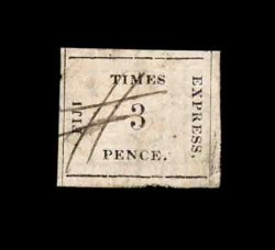 1395 O S.G. #2 var. imageS.G. #2 var., 1870 3p Black on rose quadrille paper, variety comma after "Express", position 22, this is one of the three positions that were converted to the 9p in the second issue, and this position is also the one that shows the comma after "Express" in that value, however unlisted on the 3p First Issue, such as this example, which also show the "comma", it is hard to tell whether this is a comma inserted by error or whether it is a period that became distorted, as the previous unused examples illustrate it does not always print like a comma, this stamp shows the comma configuration as well as any 9p stamp and certainly warrants listing, an attractive used single with impressive margins, rouletting is complete on three sides, and though missing at bottom, as is usual for the outer sheet edge, the bottom margin is as large as the others, ms. "#" cancel, good color, small closed tear at top right, otherwise extremely fine and a nice example of this value and variety; catalog values are for the normal stamp; clear 1986 RPS certificate as normal S.G. #2 (Scott #2; $2,500.00). (Image) £3,500+